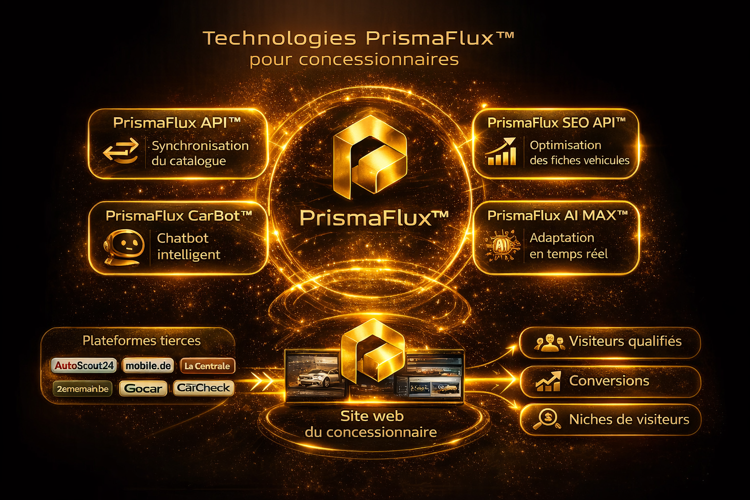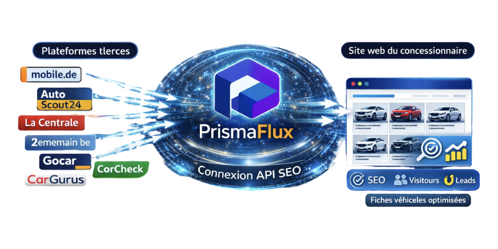 Avec PrismaFlux, les fiches véhicules vivent sur votre site : vous créez un contenu riche et structuré que Google peut valoriser, vous gardez l’utilisateur dans votre univers, et vous augmentez les chances de conversion (appels, formulaires, demandes d’essai) sans dépendre d’un portail externe.